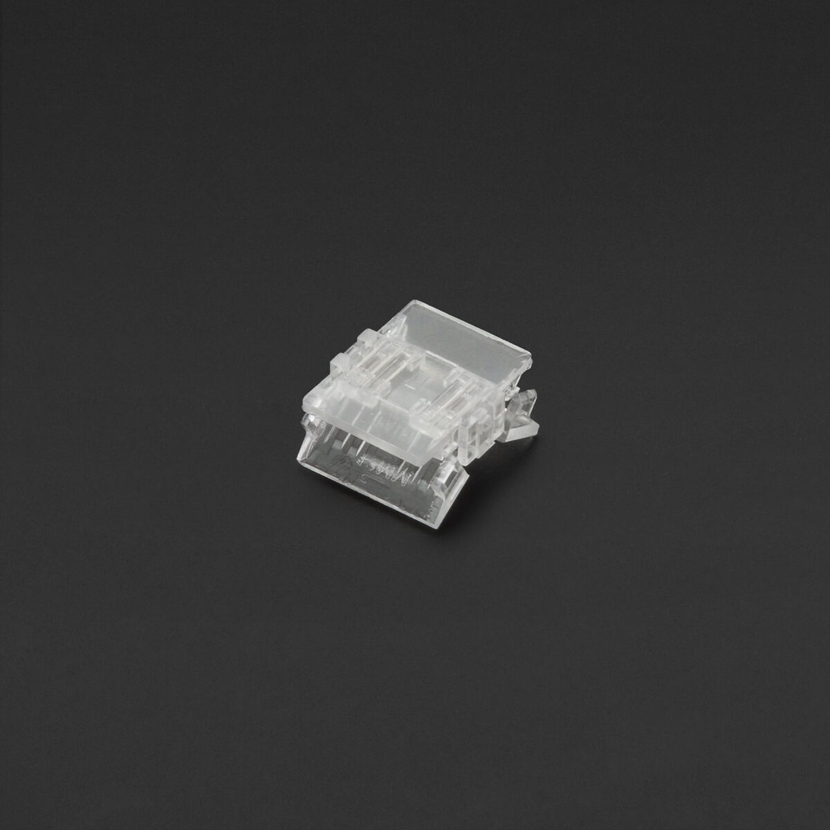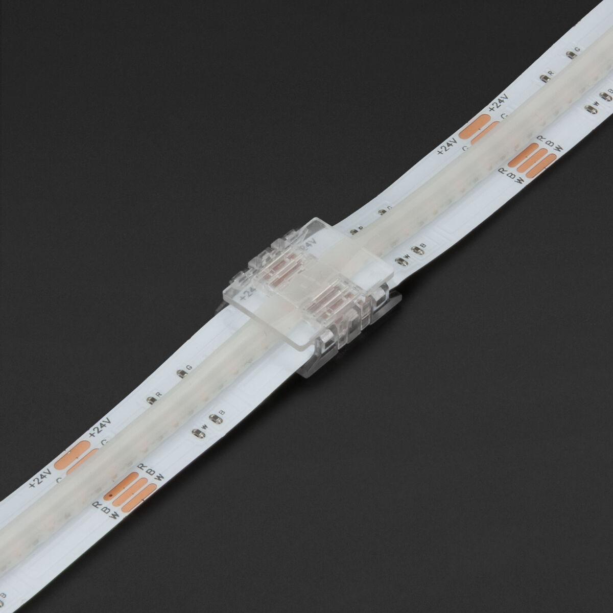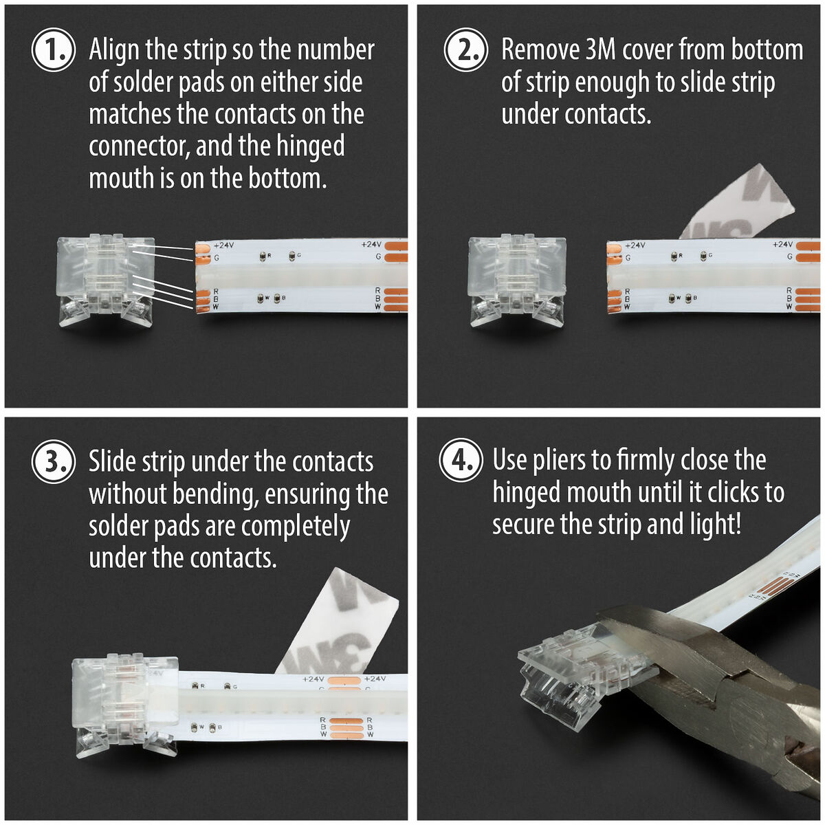 Solid Apollo's 12mm Clampdown RGBW COB LED strip joiner is a useful accessory for connecting two 12mm RGBW COB LED strips without soldering. Installation is quick and simple with easy to use clampdown terminals. Simply peel the adhesive backing on the LED strips, align strips' copper pads to match inside the joiner, insert the strips, and press down firmly on the hinged mouth with pliers to create a strong connection.