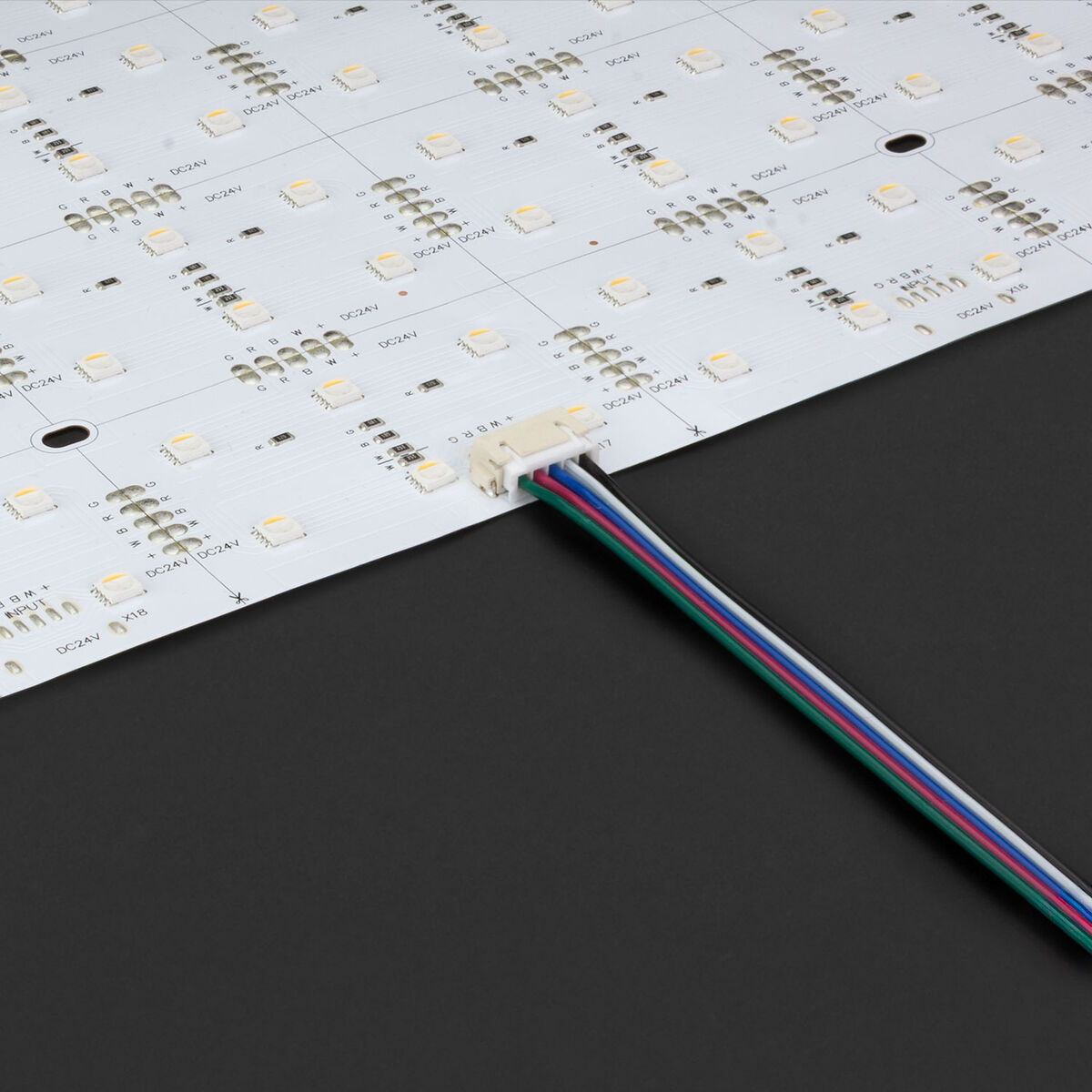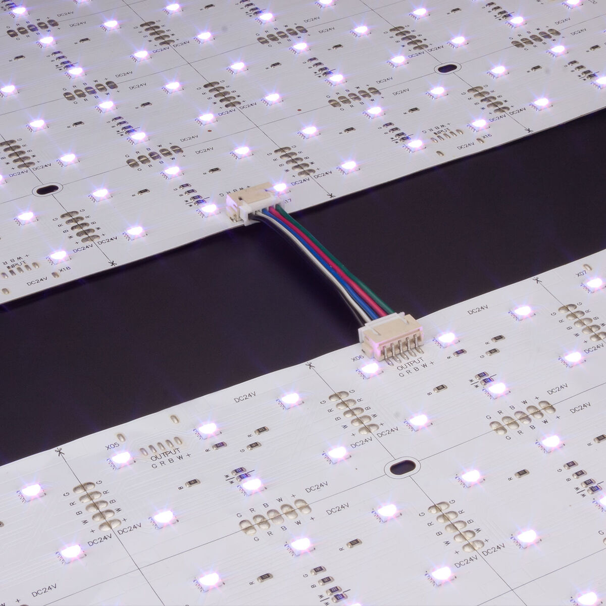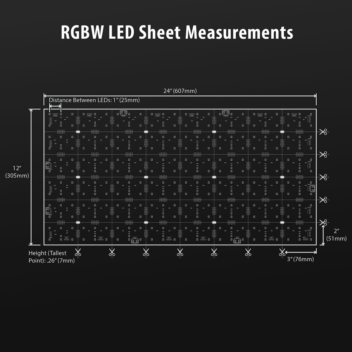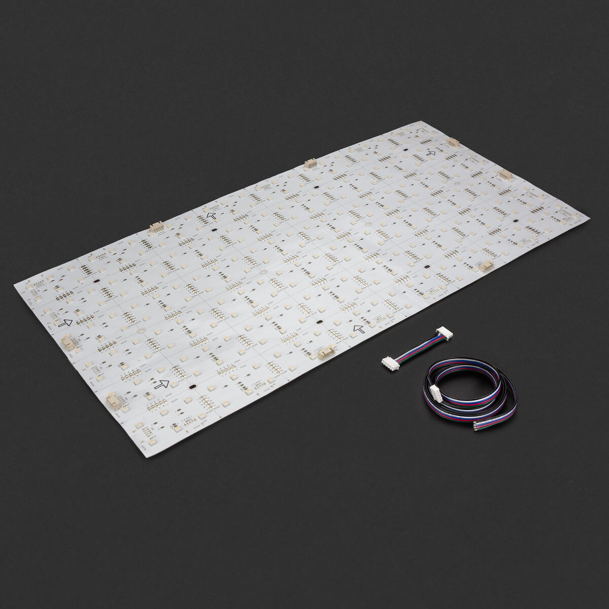 Two full RGBW sheets can be run on a single power feed. Onboard connectors around the sheet allow for easy plug and play use with the included power adapter and interconnector. Custom cut sections that may not include an onboard connector can easily be attached using the solder pads present on every cuttable section of the sheet.